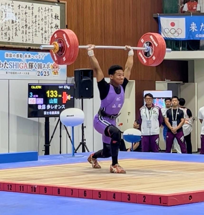 富士北稜高校 > 部活動 > ウエイトリフティング部 > ㊗国スポ滋賀大会 後藤君 重量挙げ67kg級C&J競技で優勝 2025年10月9日カテゴリー: 部活動 ウエイトリフティング部 ㊗国スポ滋賀大会 後藤君 重量挙げ67kg級C&J競技で優勝 3年後藤歩レオンス君が、インターハイに続き国民スポーツ大会でも優勝(C&J競技)しました。