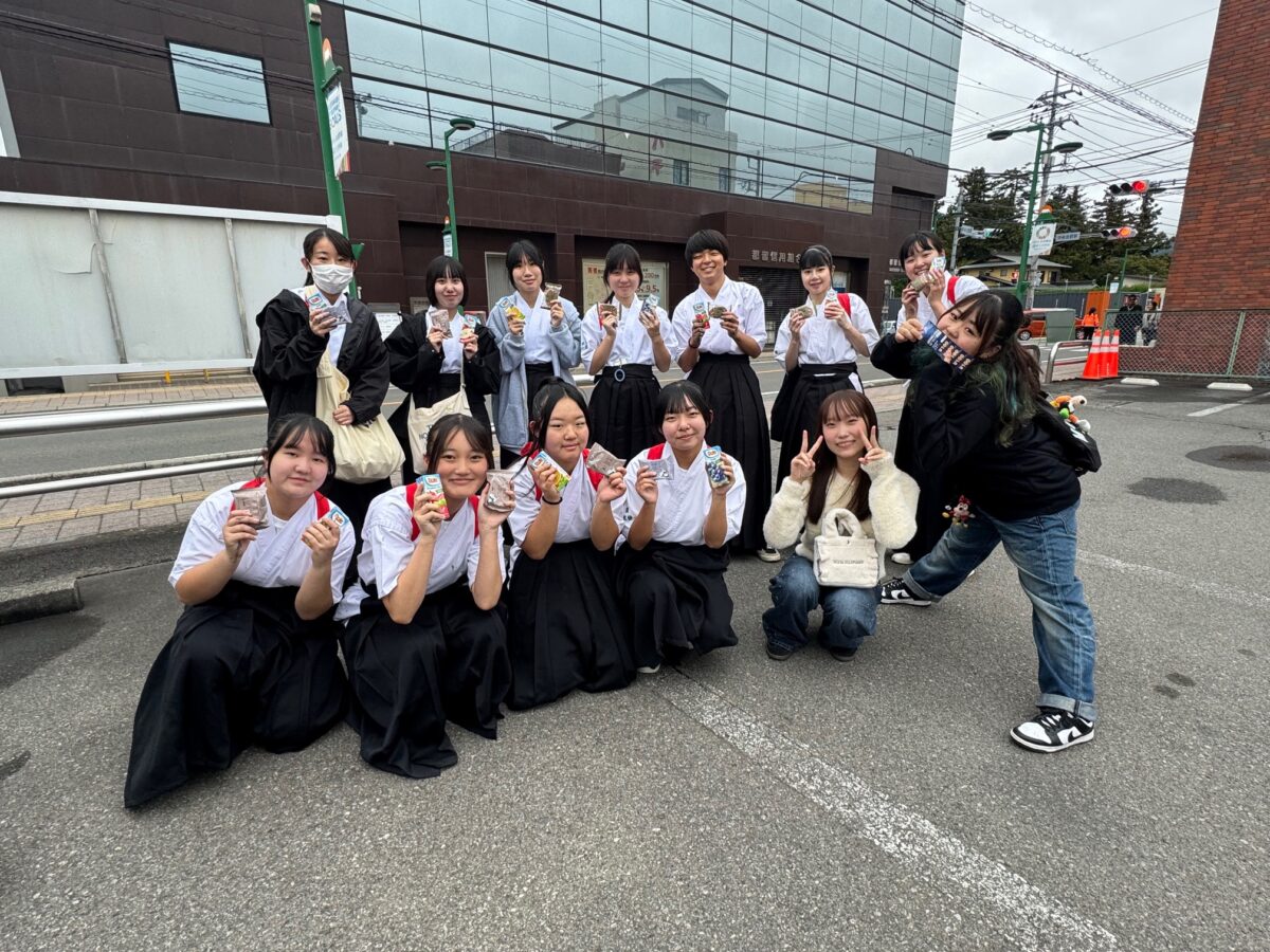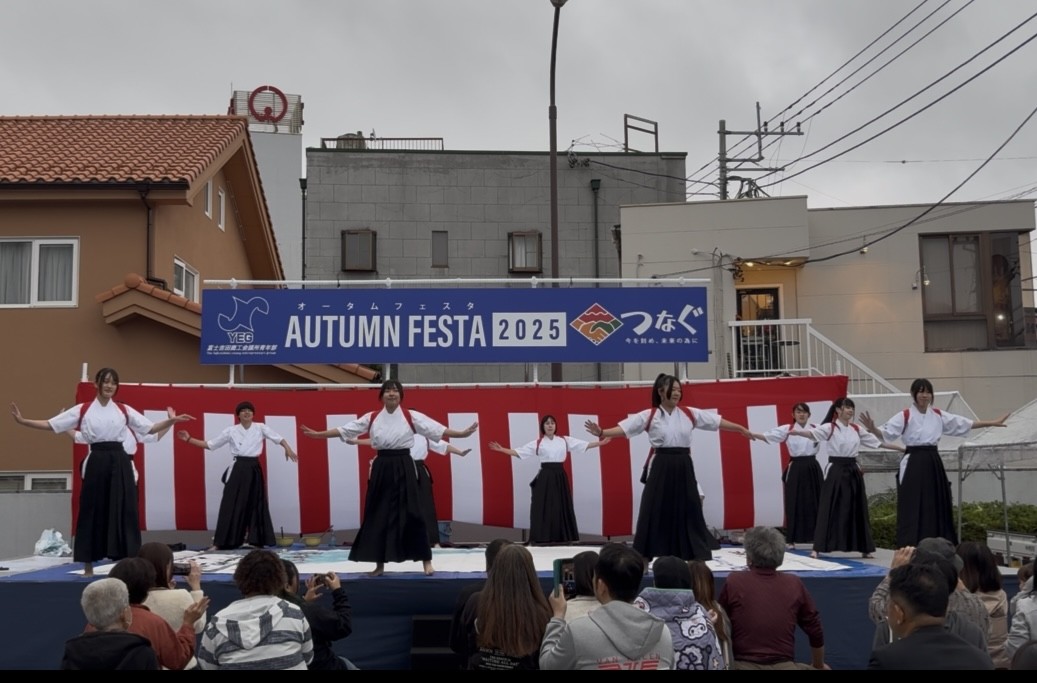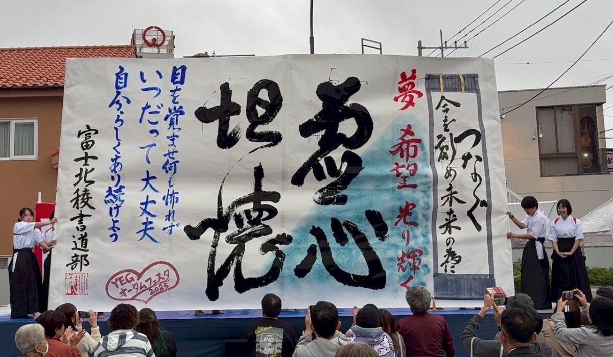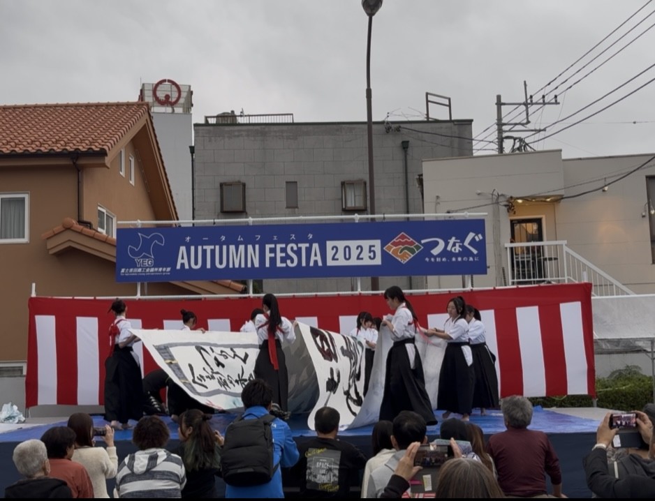 10月19日(日) 富士吉田商工会議所青年部主催の「オータムフェスタ2025」が開催されました。午前中小雨が降るあいにくの天気でしたが、昼過ぎには雨も上がり、14:30から北稜書道部がメインステージで「虚心坦懐」つなぐ2025versionを披露しました。2025年最後の書道パフォーマンスを堂々と、そして明るく楽しく一致団結して演技しました。「書道パフォーマンスを目の前で初めて見て、その迫力に感動しました!」というMCの声を聞き、「今後もパフォーマンスを見てくださる人に少しでも感動を伝えられれば…」と部員一同次回の披露に向けて心を一つにしました。会場のあちこちで北稜の緑・赤・青のジャージの生徒たちがボランティアとして積極的に活動していました。北稜と地域が繋がっている感じがしました。お疲れ様でした。