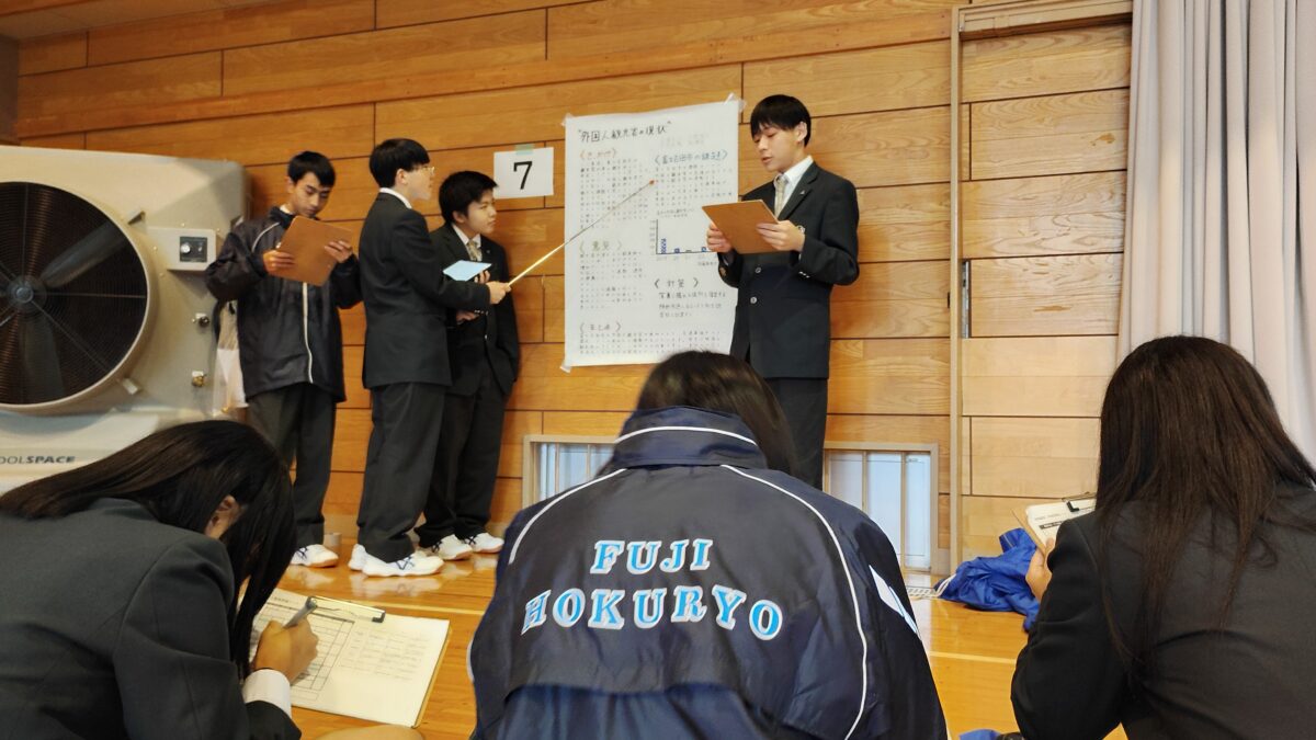富士北稜高校 > 学校行事 > 総合学科 > 1年次生 総合的な探究の時間 ポスターセッション 2025年11月4日カテゴリー: 学校行事 総合学科 1年次 1年次生 総合的な探究の時間 ポスターセッション 10月31日に、総合的な探究の時間の取り組みとして、ポスターセッション形式の発表会を開催しました。 今回のテーマは 「地域探究」―富士吉田市の良いところを見つけよう― です。 生徒たちは、8月から現在までの期間、調べ学習を重ね、ポスター制作や発表原稿の準備をすべて自分たちで行ってきました。発表者はそれぞれ工夫を凝らし、堂々と楽しそうに発表する姿が見られました。聞き手の生徒も、質疑応答に積極的に参加し、活発な意見交換が行われました。 住み慣れた地域でありながら、新しい発見が多く、地域の魅力を再認識する機会となりました。