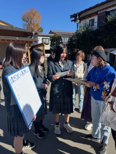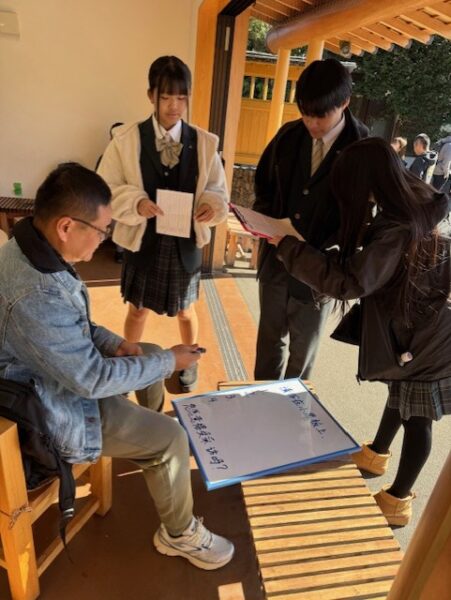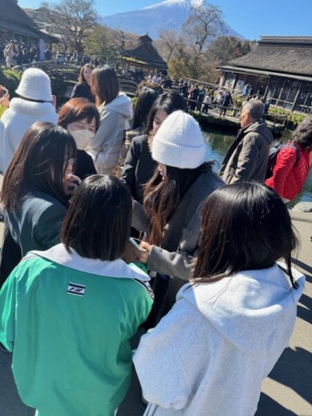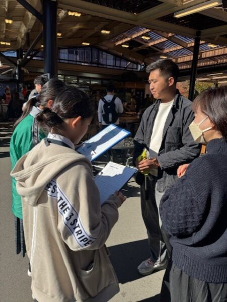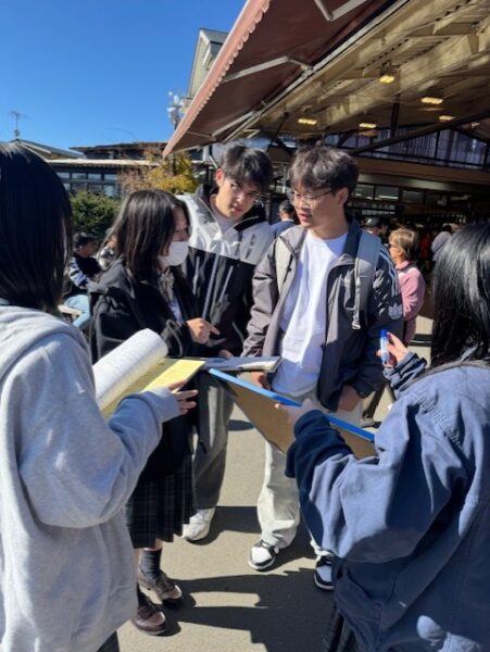 富士北稜高校 > 教育活動 > 総合ビジネス系列 > 你来日本的目的是什么?(Youは何しに日本へ?)~中国語校外学習~ 2025年11月17日カテゴリー: 総合ビジネス系列 教育活動 你来日本的目的是什么?(Youは何しに日本へ?)~中国語校外学習~ 雲一つない快晴の11月17日、総合ビジネス系列観光コース中国語選択の14名の生徒が、忍野八海で街頭インタビューをしました。「実践的なコミュニケーション能力の向上と、日ごろの学習の成果を確認する」という目標の元、3週間前から各班で準備をしてきましたが、いざ人の前に立つと思い通りにいかず、発音の難しさや人に話を聞くことの大変さなどを思い知らされました。それでも、自分の考えた質問を発音し、それが相手に通じた時の嬉しさも感じることができました。約50分の限られた時間の中、5件・6件と多くのインタビューができた班もありました。今日のインタビュー内容を各自でまとめ、反省して今後の課題を見つけていきたいと思います。