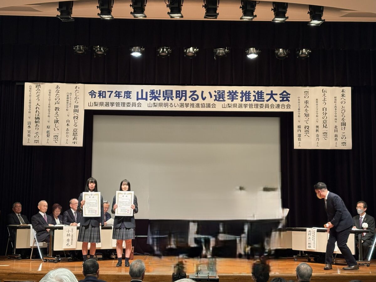 11月14日に山梨県選挙管理委員会が主催する「明るい選挙推進大会」に3年次生3名が参加しました。明るい選挙キャッチフレーズと高校生選挙作文コンテストの2部門で入賞し、表彰を受けました。作文コンテストの入賞者は大会参加者の前で作文を堂々と朗読してきました。普段の学びが表彰に結び付き、3名の生徒の表情も誇らしげでした。
