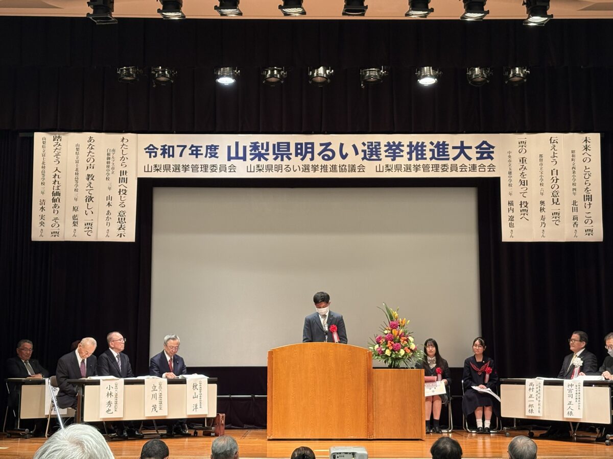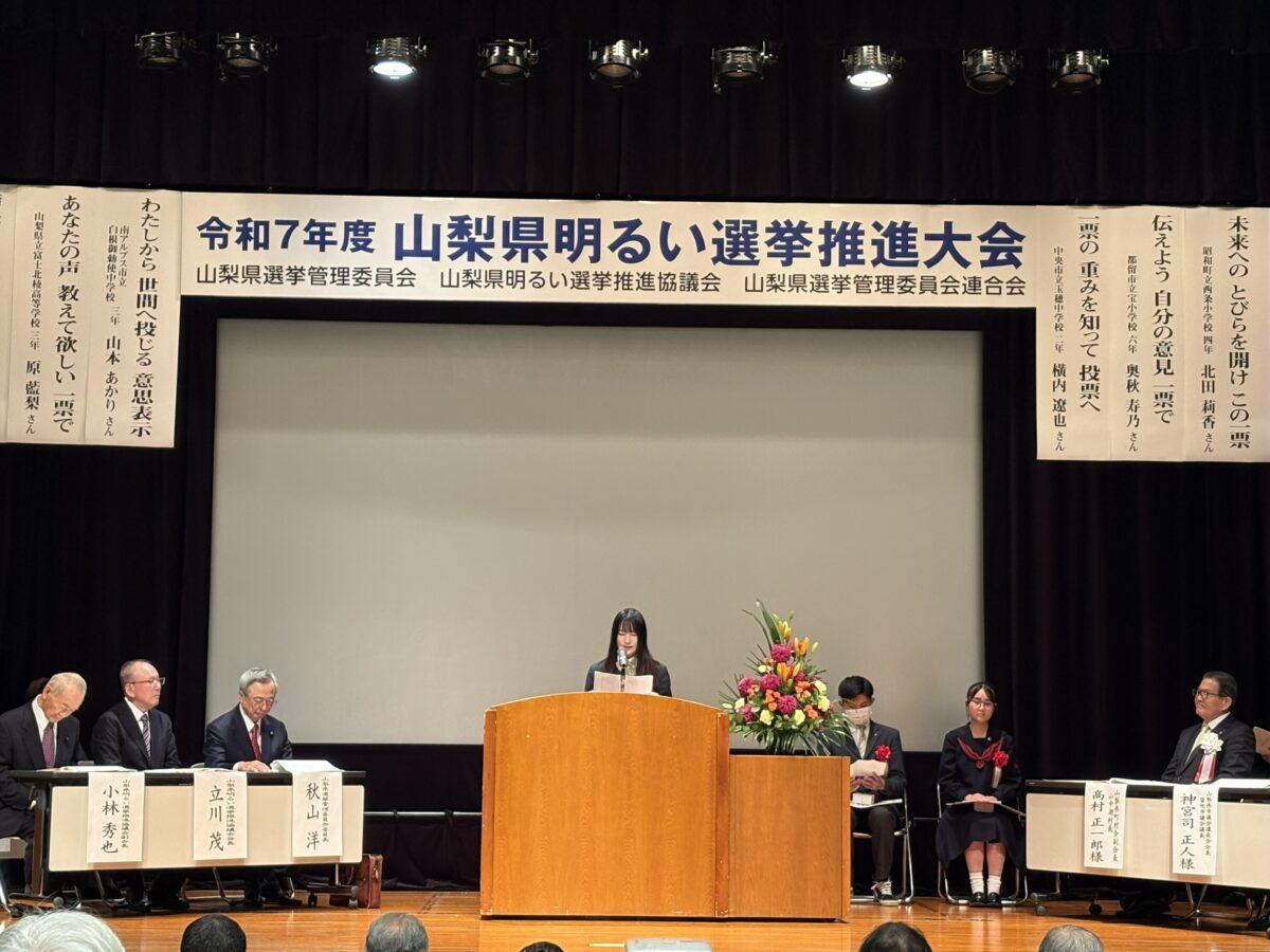 富士北稜高校 > 教育活動 > 教養系列 > 明るい選挙推進大会に参加しました 2025年11月19日カテゴリー: 教養系列 教育活動 明るい選挙推進大会に参加しました 11月14日に山梨県選挙管理委員会が主催する「明るい選挙推進大会」に3年次生3名が参加しました。明るい選挙キャッチフレーズと高校生選挙作文コンテストの2部門で入賞し、表彰を受けました。作文コンテストの入賞者は大会参加者の前で作文を堂々と朗読してきました。普段の学びが表彰に結び付き、3名の生徒の表情も誇らしげでした。