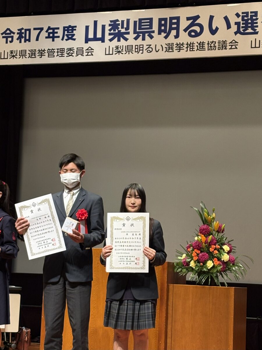 富士北稜高校 > 教育活動 > 教養系列 > 明るい選挙推進大会に参加しました 2025年11月19日カテゴリー: 教養系列 教育活動 明るい選挙推進大会に参加しました 11月14日に山梨県選挙管理委員会が主催する「明るい選挙推進大会」に3年次生3名が参加しました。明るい選挙キャッチフレーズと高校生選挙作文コンテストの2部門で入賞し、表彰を受けました。作文コンテストの入賞者は大会参加者の前で作文を堂々と朗読してきました。普段の学びが表彰に結び付き、3名の生徒の表情も誇らしげでした。
