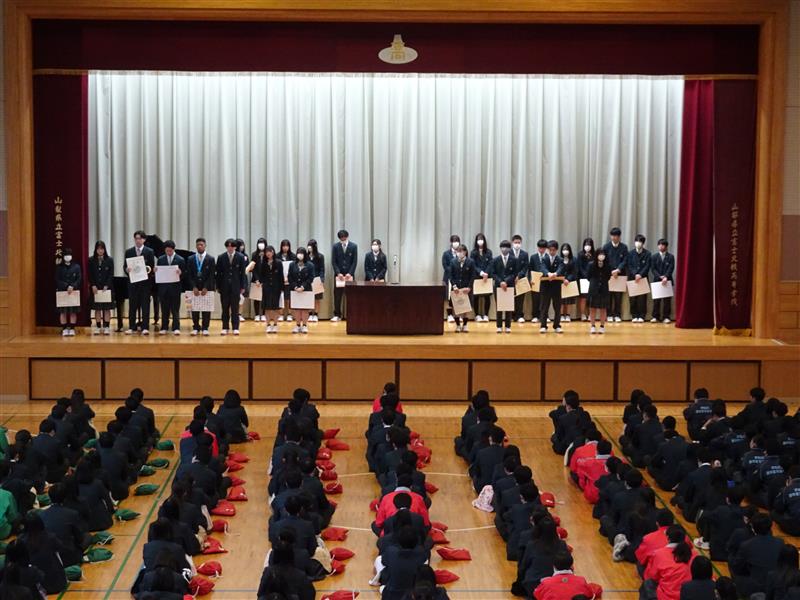 納め式では、各系列や部活動が全国大会や県大会での輝かしい成果を納めました。生徒の皆さんの努力と活躍に、会場は大きな拍手に包まれました。