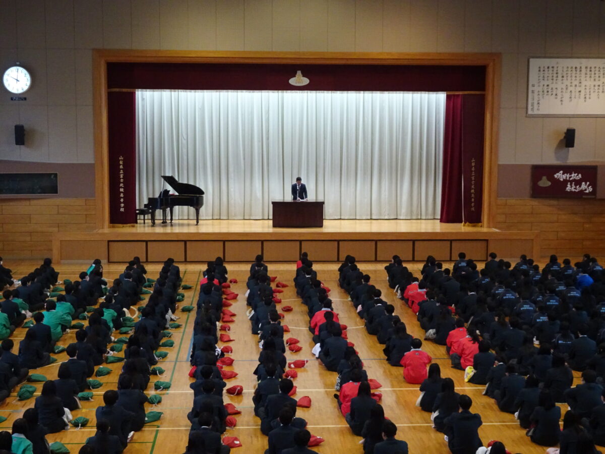 富士北稜高校 > 教育活動 > 教養系列 > 納め式・休業前集会 2025年12月24日カテゴリー: 教養系列 教務教育工学 福祉健康系列 学校行事 総合ビジネス系列 教育活動 部活動 電気情報系列 陸上競技部 生徒会指導 剣道部 ウエイトリフティング部 吹奏楽部 美術部 写真同好会 納め式・休業前集会 12月24日(水)、納め式と休業前集会を実施しました。 納め式では、各系列や部活動が全国大会や県大会での輝かしい成果を納めました。生徒の皆さんの努力と活躍に、会場は大きな拍手に包まれました。 休業前集会では、校長先生と生徒指導主事から大切なお話をいただきました。 生徒の皆さんが健康で充実した冬休みを過ごし、来年さらに飛躍できることを期待しています。