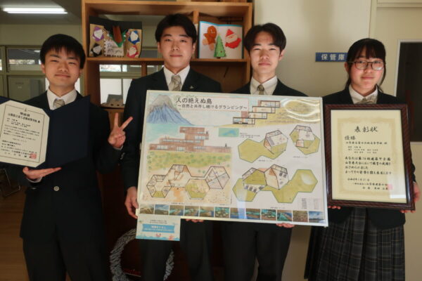 富士北稜高校 > 教育活動 > 建築デザイン系列 > 【建築デザイン系列】建築甲子園で奨励賞を受賞! 2026年2月24日カテゴリー: 教育活動 建築デザイン系列 【建築デザイン系列】建築甲子園で奨励賞を受賞! 建築デザイン系列3年生の設計競技班4名が、公益社団法人日本建築士会連合会主催の「第16回高校生の建築甲子園」全国選手権大会に、山梨県代表として出場し、奨励賞を受賞しました!テーマに沿ってアイデアを出し合い、設計を何度も練り直しながら完成させた作品に、「チームで頑張った成果が形になってうれしい!」と笑顔があふれました。