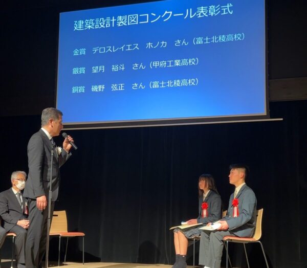 2月7日(土)、甲府市歴史文化交流施設こうふ亀屋座で開催された、山梨県建築士会主催「第9回 山梨県建築士の集い」にて、第24回山梨県工業高校生建築設計製図技能検定の優秀者表彰が行われました。本校からは建築デザイン系列3年次生2名が金賞・銅賞を受賞し、さらに系列の学びについても代表生徒が発表。堂々とした姿に成長を感じる1日となりました。