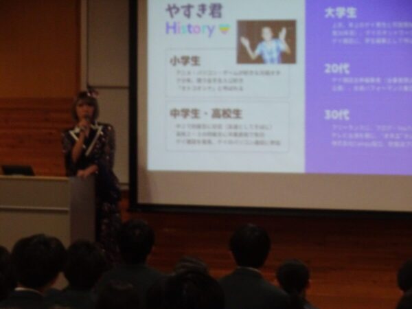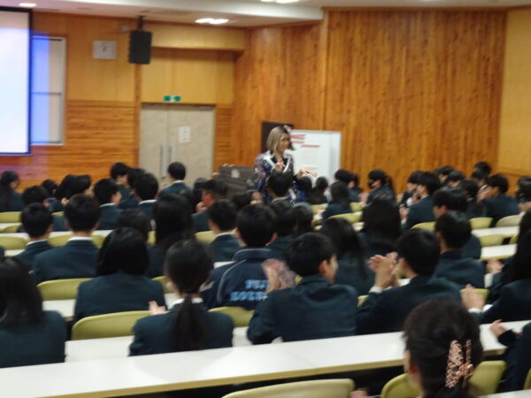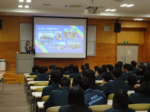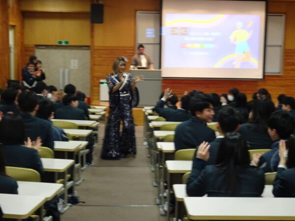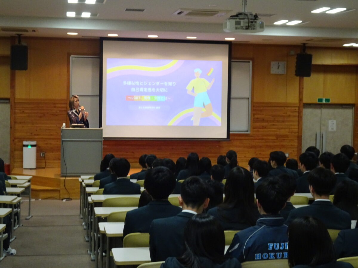 ご自身の生い立ち、性の多様性やLGBTQ+性的少数者への理解につながる内容、自己肯定感などの話をスライドショーでの説明や生徒を交えた意見交換を行いながら、「自分を持つことの大切さ」や「多様な人を認め合える社会」を目指していってほしいと話されていました。
