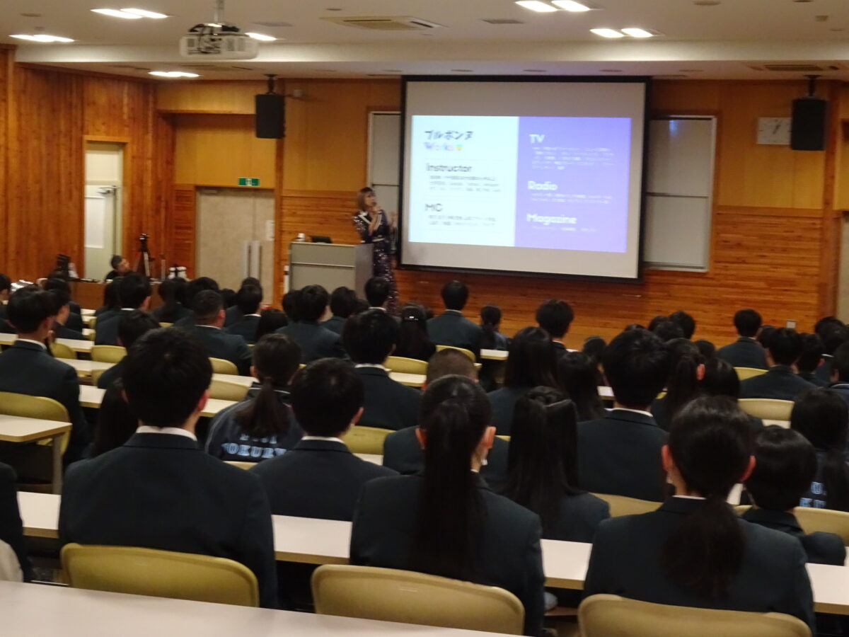 3月13日、本校の視聴覚室で1年次生を対象に、女装パフォーマーとして活躍するブルボンヌさんを講師としてお招きして「多様なものの考え方を受け入れられる生徒になってほしい」との願いのもと「多様性を学ぶ講演会」が開かれました。この講演会では、人種、性別、年齢、性的指向などの違いを受け入れ、互いの個性を認め活かし合おうとする考え方や姿勢を学ぶ機会とするために実施されました。本校では6年連続の講演となりました。