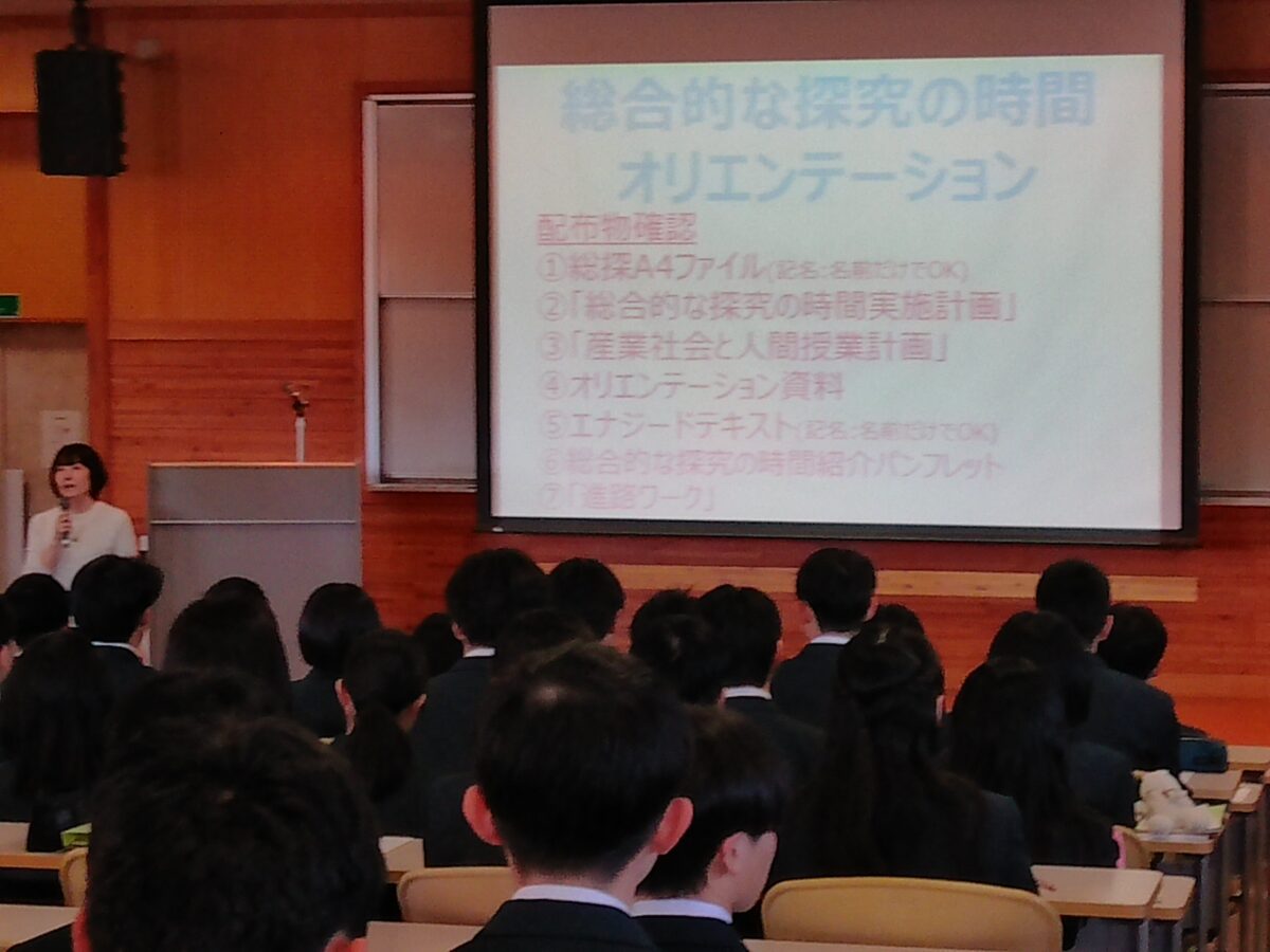 「総合的な探究の時間」は1年間の計画の中でかえる組の活動についても触れました。地域と自分をよりよく「かえる」活動で先輩からの体験談もありました。また「エナジード」で学ぶ内容などの説明をしました。次の時間では「産業社会と人間」のオリエンテーションを行いました。、6つの系列の中から将来の進路を考えての系列選択をしていく説明をいたしました。