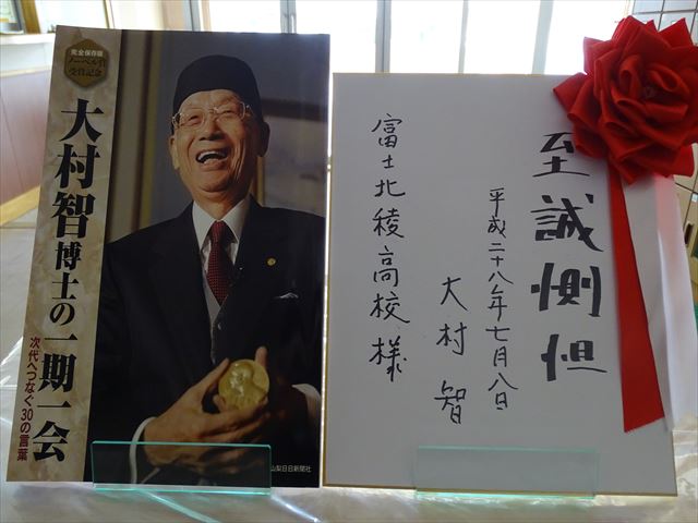 富士北稜高校 > 学校行事 > 総務 > ノーベル賞受賞 大村 智博士から、サイン色紙を頂きました 2016年11月21日カテゴリー: 総務 ノーベル賞受賞 大村 智博士から、サイン色紙を頂きました 平成28年7月8・9日、関東地区高等学校PTA連合会第62回山梨大会が小瀬武道館で行われました。本校3年次のPTA役員の皆さんは「接待係」として参加し、2015年ノーベル生理学・医学賞を受賞された大村 智 博士とお話ができました。これは先生に書いていただいた本校宛のサインです。大村博士は、地元山梨の高校生の保護者と話すことができて大変嬉しそうでした。来賓の方々は本校PTAの方々の気配りと対応に感謝の気持ちで一杯だったと聞いております。また、山梨県高等学校PTA連合会事務局からもお褒めの言葉を頂きました。サイン色紙は正面玄関の受賞棚に飾ってあります。PTAの皆様、ありがとうございました。