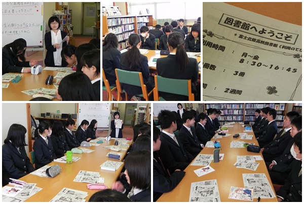 富士北稜高校 > 教育活動 > 図書館オリエンテーション 2017年4月14日カテゴリー: 教育活動 図書館オリエンテーション 4月14日(金)に1年次生対象の図書館オリエンテーションがクラス毎に行われました。司書の池田先生から図書館の利用方法と読書についてのお話があり、その後館内を自由に見学しました。きれいで明るく広々として、蔵書数も多い図書館に驚いている生徒もいました。
