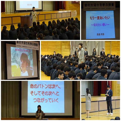 平成29年5月12日(金)6校時に「命の大切さを学ぶ授業」が行われました。講師は山形市在住の渡邊理香先生で、自身が交通事故で大切な娘さんを亡くされた経験をお話しして下さいました。先生は、毎日あたりまえに会える家族を失って知った、「あたりまえの幸せ」は「たった一人のあなた」がいることだと教えて下さいました。