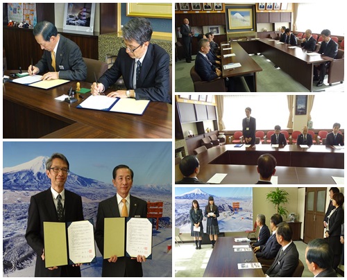 平成29年11月28日(火)に市役所にて、本校と富士吉田市との包括的連携に関する協定書の締結式が行われました。生徒の社会参画や、地域に貢献できる人材育成に取り組んでいる本校と、それを後押しして下さる富士吉田市とが協定を結び、更なる発展に向けて協力していくことをお約束しました。調印をした後、生徒による総合的な学習の実践事例を発表をさせていただきました。