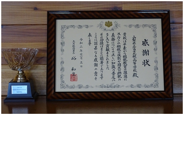 本校は、租税教育推進校として大月税務署長より感謝状を受章しました。