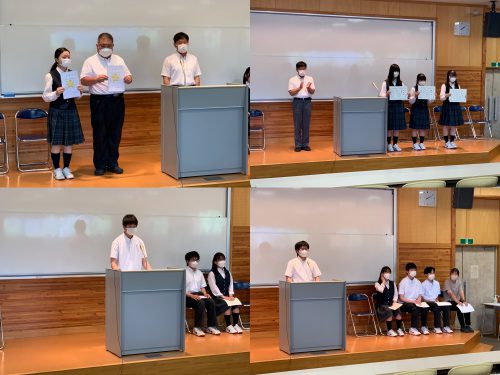 全校生徒から募集した交通標語の中から優秀賞に選ばれた3名の生徒の表彰と、代表者の交通安全宣言文の発表の様子が全校の教室に放送されました。