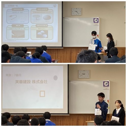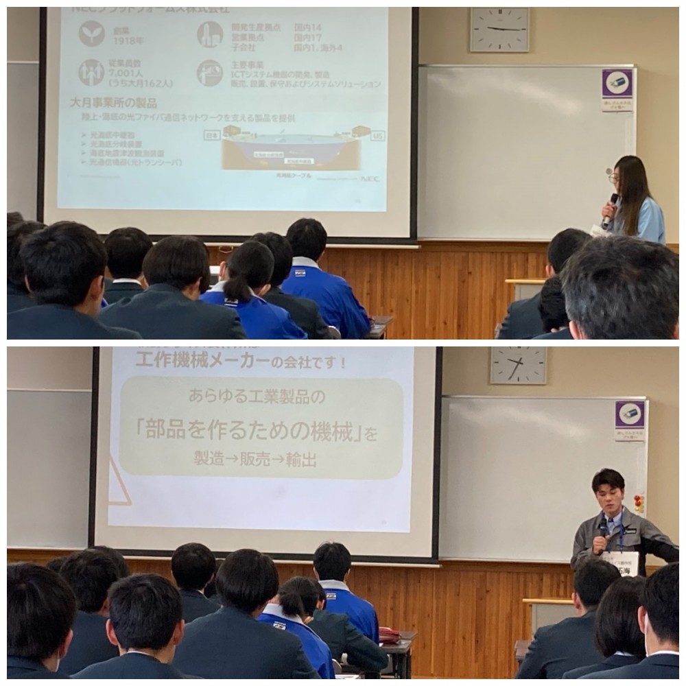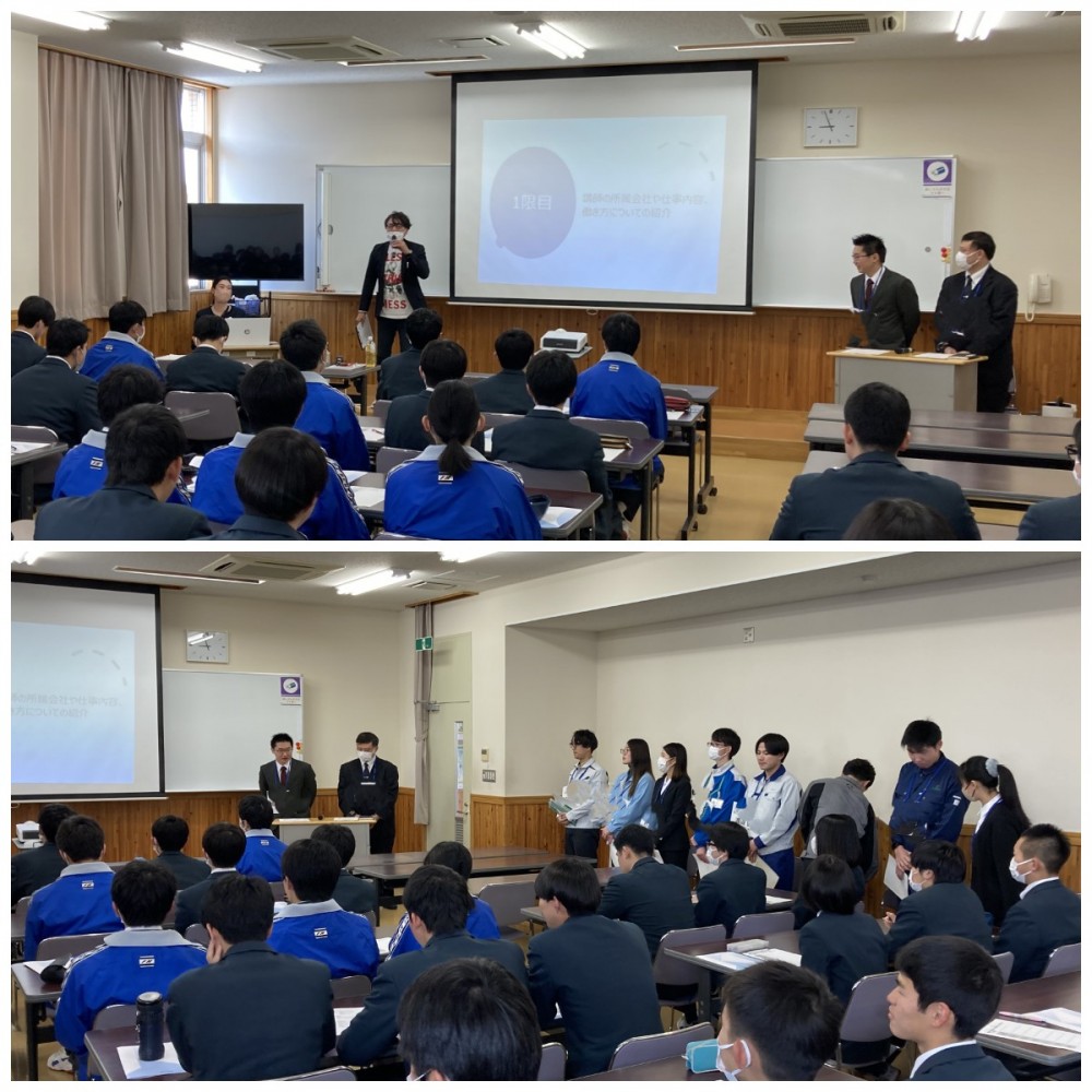 県産業労働部人材育成課より、地元製造業への理解を深めてもらうため依頼があり、本校工業科の2年次生を対象に行われました。