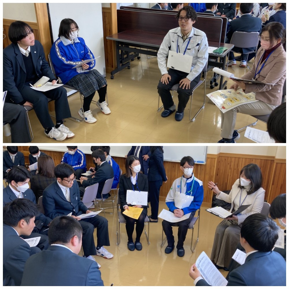 富士北稜高校 > 部活動 > 製造業技術者等と高校生の意見交換会 2024年2月8日カテゴリー: 部活動 製造業技術者等と高校生の意見交換会 本日2月8日、本校にて「製造業技術者等と高校生の意見交換会」が行われました。 県産業労働部人材育成課より、地元製造業への理解を深めてもらうため依頼があり、本校工業科の2年次生を対象に行われました。 地元の製造業7社より本校卒業生を中心とした若手技術者から、各企業の説明や日頃心がけている事、また必要なスキル・能力などについて話をしていただきました。その後各グループに分かれて生徒と意見交換会を実施しました。司会を担当していただいた「ボイスルーム」様の軽快な進行で、生徒達も企業の方々と非常に楽しく意見交換をしていました。今日の体験を今後の進路実現に役立てもらえたらと思います。