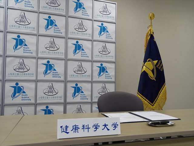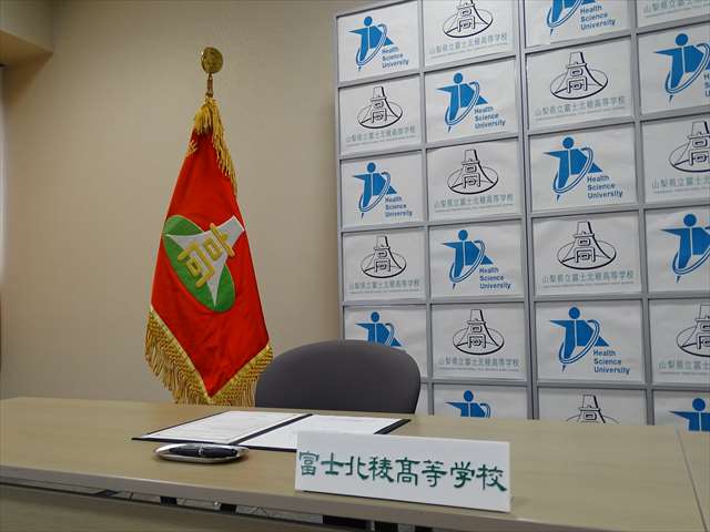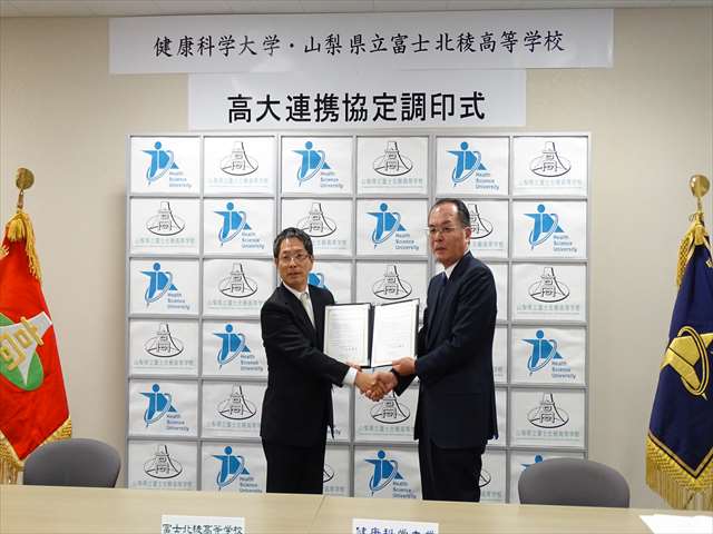 健康科学大学と富士北稜高校は相互に連携し交流を深めることとしました。大学の公開講座への参加、部活動の交流、大学祭や紅稜祭の交流などを平成28年度からスタートさせます。