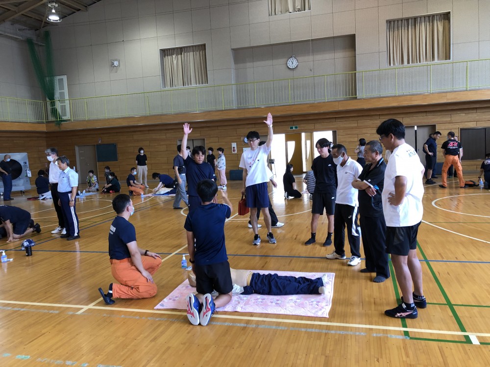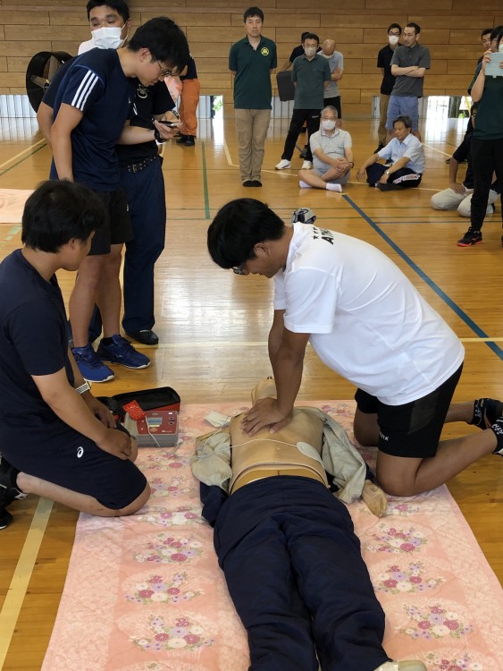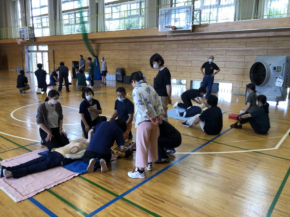 8月22日(木)、職員対象の心肺蘇生法講習会を実施しました。富士吉田消防署から10名の講師を招聘し、緊急時の対応方法(胸部圧迫、AED使用方法など)を教えていただきました。もしもの時に備え、真剣に講習を受けていました。講習の最後には、緊急通報の練習も行いました。